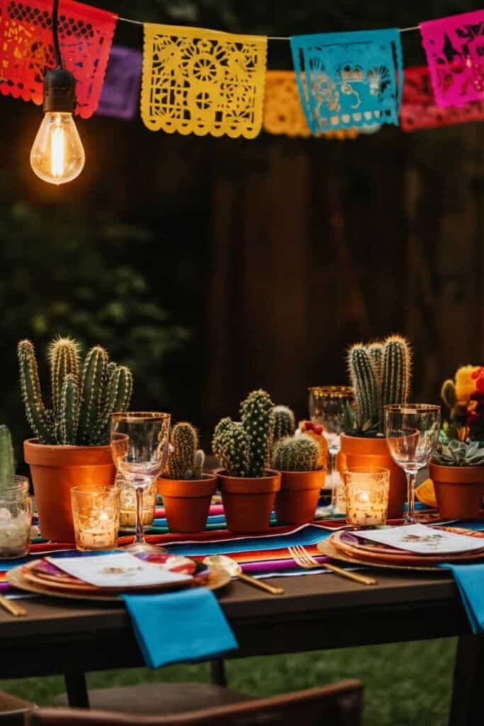 Set the tone with eye-catching decor. Use a colorful table runner, bold-patterned plates, and traditional papel picado banners to add vibrance. Sprinkle mini succulents or potted cacti as centerpieces for a natural, eco-friendly touch.