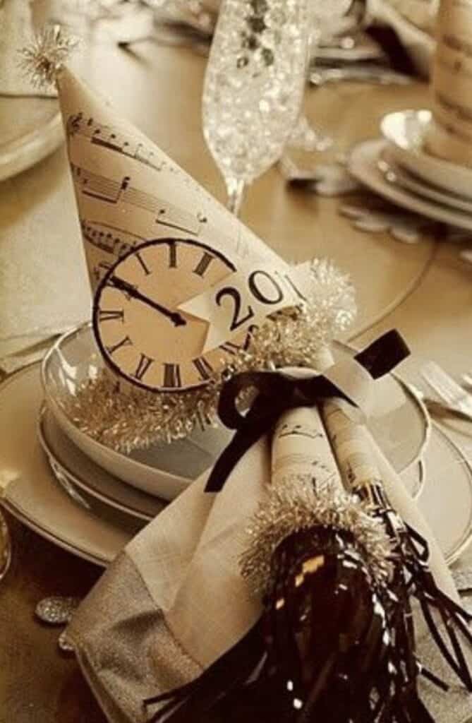At its base, a mini clock face ticks toward the new year. framed by fluffy tinsel and a black velvet ribbon tying up a linen napkin.