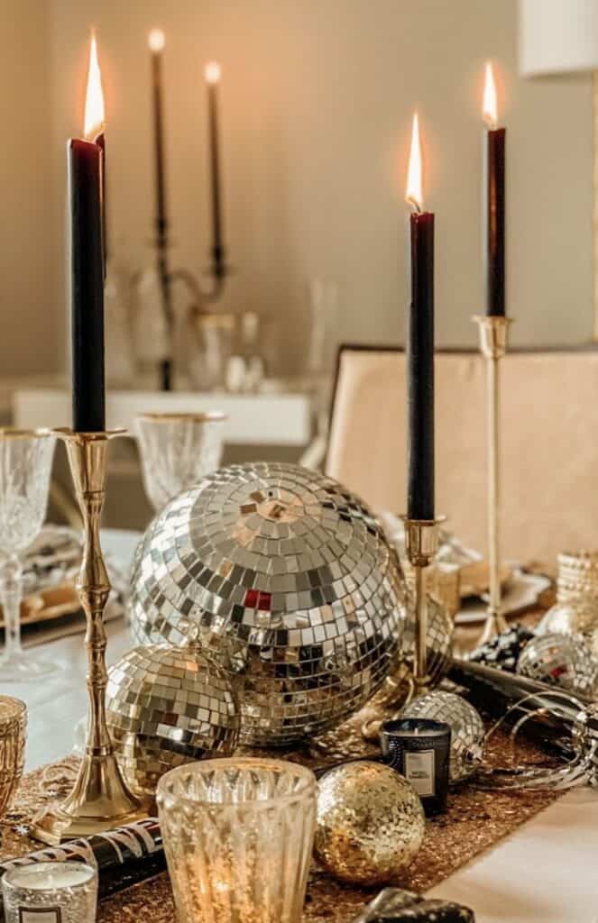 Black taper candles flickering dramatically beside massive mirrored disco balls on brass holders, all against a creamy tablecloth edged in gold.