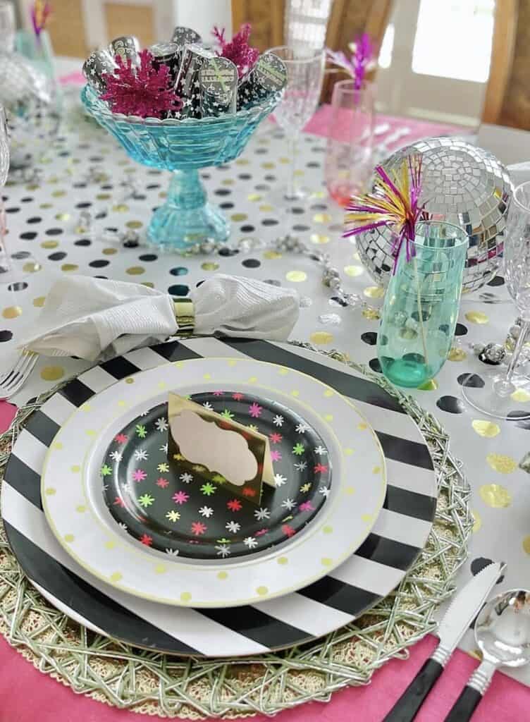 Starburst plates in neon pops sit under a bigger plate ringed in gold and polka dots, with layers of fun chargers.